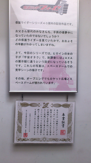 我選了跟去富士急樂園採取一樣的交通方式,就是坐巴士去。 (也可以坐電車換乘假日才有的循環巴士,但感覺不會比較省事省時就放棄了) 官網上也有寫,到東京車站八重洲南口的巴士站旁邊買票就行,上週才剛去過富士急,還沒忘記怎麼買票。 因為我日文口語很爛(尤其是數字跟日期都不怎麼會講^q^) 直接寫下時間跟地點拿給賣票的阿叔看,很方便的(爆) 坐往筑波CENTER方向的巴士,票價1150日幣,離JAXA最近的是並木一丁目, 因為是自由席,去程只能買單程票,回程的車票直接搭上公車買就行了。大概坐一個小時就到了,沿路看看街景, 下車就是在筑波宇宙CENTER正前面呢,當天風很大天氣很好,遠遠地就能看到那個火箭! 水瓶妹子跟阿弦和悠希老是在前面跳來跳去的那個! 才一進館,第一個走道直直走就可以通到物販區,廁所對面牆壁上就掛著4z的宣傳裱框海報啊(笑) 上方是簡單的介紹,提到4z的女主角是個宇宙阿宅(笑),下方還有天高的畢業證書! 立馬拿出相機來拍拍~初期假面騎士社的三人組!! 初期賢吾好可愛啊啊啊啊(後期也很可愛!通通都很可愛!!!←有病 物販區旁邊正在辦展,主題是從宇宙拍地球的景點, 還可以掃QR code用手機看解說,但使用此功能的人少到爆炸,我是第二個的樣子(笑) 賣的東西也很有趣,有很多宇宙食物以及紀念品跟T恤等等,宇宙兄弟的週邊有一櫃www 雖然物販區很吸引人......但還是決定先去逛逛本體再說,雖然有點想報名見學解說,但還是決定自己閒逛比較自由,就沒報名了。 直接前往DOME區參觀,雖然是週六,但其實也沒什麼人,除了一兩隊小學生團見學外只有滿零星的遊客, 逛起來很舒服,到DOME門口, 站在阿弦與賢吾君47話站的地球前真超感動的啦(笑) OP中也有出現,老實說現場模型我覺得還好,但拍照起來真的超美耶! ...大概是我一直偷笑...太噁心了,被旦那教訓「來這裡參觀,可以看到人類克服了只能活在地球上的命運,前往宇宙,是個充滿夢想的地方,可是妳的眼裡只充滿欲望啊!」 可惡!這時我要學鴻上會長說「...素晴らしい欲望だ!!!」啦 我也是充滿夢想的啊!我也想在這裡參觀弦賢的定情擁抱喔呵呵(產生幻覺了 好啦,拋掉腐濾鏡不說,來這裡參觀的年齡層還是偏低,很多大人帶小孩子來,小朋友對宇宙與星空真的是充滿嚮往呢! 就算我們沒報名見學,但現場還是有解說員大叔親切地幫忙解說。 解說大叔提到要在30分鐘內帶我們瞭解這裡展示的火箭與人造衛星的部份, 但現場的參觀民眾...超不踴躍的囧,雖然短時間內有一堆人聚集過來,但聽他講完部份就都鳥獸散了, 連同我跟旦那在內,只有三個人從頭到尾在聽他說,另外那個小哥看起來像是要作報告,還作筆記哩 沒什麼人在聽,但內容明明就還滿有趣的啊!像他提到JAXA展示的人造衛星跟火箭多半都是真貨!(雖然是備品) 初期為了避免失敗,所以一開始他們都一次作一對人造衛星出來,成功發射之後,就把備品拿來展示惹。 還有日本的人造衛星多半是用植物命名的,有叫百合、櫻、向日葵、菊之類的。 老實說還有很多專有名詞的部份我是聽得頗吃力Orz 只記得些沒什麼營養的部份。 旦那聽解說倒是聽得津津有味,看到那些人造衛星跟火箭也覺得很開心,畢竟他也是個理科男嘛, 聽完了講解我們就開心地去拍攝一下場內的裝置。 OP中初期假面騎士社三人有跑去玩的太空衣拍照,老實說這應該是給小朋友拍照留念用的 大人的肩寬要把頭塞進去拍有點兒辛苦,要側點身吧XDDD ←也跑去拍的傢伙 火箭解說的部份出現了4Z啊啊啊好可愛喔! 場內的俯視全景 逛過一圈後坐在門口打算要走了,這時剛剛現場講解的大叔卻把我們叫了過去 本來還心裡頗為惶恐,想說是不是我的邪念(?)被發現了 大叔:「你們剛剛聽得很認真,是對宇宙真正有興趣吧!這是我私人整理的講義,就送給你們吧」 救命啊!!!大叔也太親切了喔喔喔喔喔喔喔,我明明就滿腦子邪念啊啊啊真對不起orz 大概是旦那聽得太認真了,才得到了大叔好心的贈禮,真是個用功的孩子。 直到他問我們姓名的時候,他才發現我們不是日本人啊(爆)老實說真的有夠不好意思,我我我真的是動機不純Orz 總之,得到了宇宙的秘密講義!作為紀念我還請他簽了名,真是個溫馨的小禮物!! 最後要離開JAXA前衝去物販區買了點紀念品,旦那敗了JAXA的馬克杯 我則是敗了宇宙咖哩&宇宙草莓冰淇淋wwww(都是真空包) 現在還沒勇氣試吃,改天吃了再來寫點感想XDDDDDDD 最後到馬路對面坐公車回東京,關鐵是上車買票,日本這種有上高速公路的公車賣得似乎是回數票呢, 回程1900可以買到三張票,但我們只有兩個人,所以還留了一張票當作紀念。 (還遇到同樣參觀完會場的日本老教授FU的人帶著個老外問路, 旦那一開口跟他說英文,對方立刻就問我們是不是台灣來的,好神奇喔XD,難道旦那的英文有台灣腔嗎) JAXA真是有趣!但我這種完全文科腦的類型,如果不是迷上4Z,大概一輩子也不會有機會踏入這裡吧。 迷上4Z真的讓我的人生變得更加豐富,真的是太好了呢!!XD 當天晚上還看了體育會TV!(謎樣的體育系綜藝節目 看到流星跟大杉老師還有Wiz的不死鳥與海賊的博士跟銀戰士一起比手臂耐力的體育競賽! 超神秘的啦!!!還是轉電視不小心轉到的!看到我一口茶噴出來!! 拿出手機來偷錄影的時候手機容量剛好滿了,結果撐到最後的是流星!お亮かっこいい! 號稱體育會的沖田總司XDDDD 可惜沒看到劍道的回合啊~ 